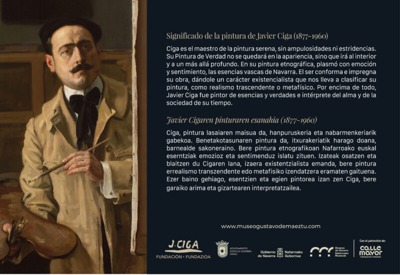 Javier Cigak Gustavo de Maeztu Museoan egindako erakusketak “FIGURAZIOA ETA ESENTZIA”, kontzeptuei buruzko hausnarketa proposatzen du, horiek baitira bere lanaren definitzaileak. Aldi berean, bi margolari handi hauek elkartu ziren, garai eta unibertso piktoriko berbera partekatuz. Biek Parisko aretoetan egin zituzten erakusketak eta 1915eko eta 1917ko Madrilgo Arte Ederren Erakusketa Nazionaletan bat egin zuten. Era berean, Frai Diego Lizarrakoaren jaiotzaren bosgarren mendeurrena ospatzeko, Cigak pertsonaia handi honen erretratua margotu zuen, Lizarrako Udalak 1924an egindako lehiaketan lehen saria lortuz, eta erakusketa honetan aurkezten da gertakizun honen protagonista gisa.
